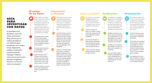 Periodistas como Paul Bradshaw plantean ya el trabajo periodístico alrededor de las bases de datos comprendiendo así varias etapas como las siguientes: