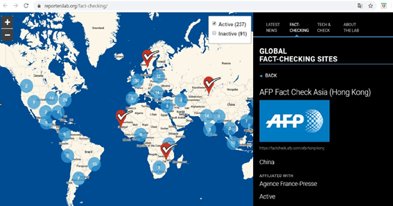 Las agencias de verificación de datos que encontramos por todo el mundo son muy diversas. En el caso de EEUU encontramos hasta 59 agencias distribuidas por todo el país. Algunas de las agencias de fact-checking más conocidas son: Snopes, Factcheck y Politifact ya que son las encargadas de detectar las noticias falsas que circulen en Facebook. Su método funciona de la siguiente forma: se basa en dos pasos, primero, los usuarios tendrán la opción de marcar las noticias como falsas para que un equipo de la propia red social revise si estas publicaciones proceden de medios reales o de webs que intentan dar la impresión de serlo (por ejemplo, bbc.co en lugar de bbc.com).