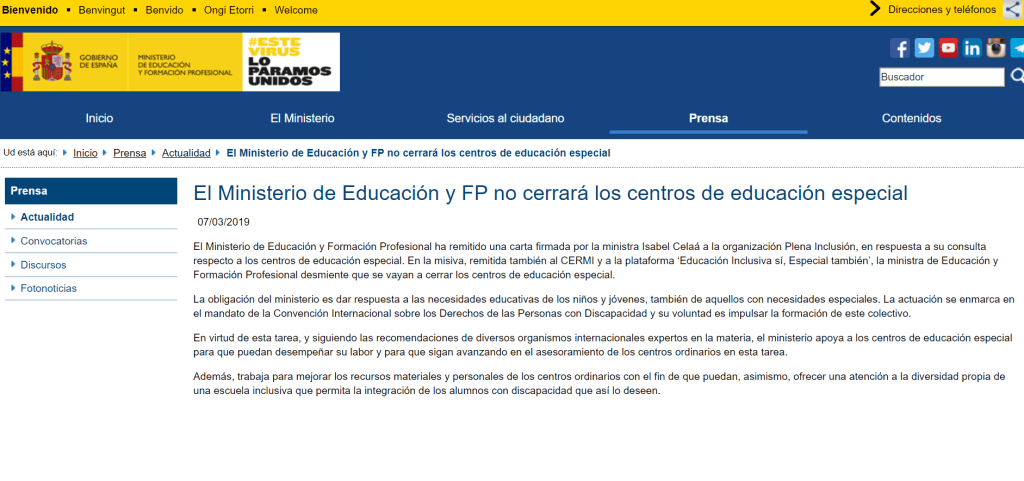 La difusión masiva estos días de la campaña que circula por la red Instagram con etiquetas como #sancheznocierresmicole y #especialtambién afirma que el Gobierno aprovecha el Estado de Alarma para proceder a una reforma de la Ley Orgánica de Eduación (LOMLOE) en la que se contempla la eliminación de los colegios de educación especial. Pues bien, esta información es completamente FALSA ya que así lo ha desmentido el Ministerio de Educación y aclarado en el año 2019 . Explican a RTVE que el plan es “dotar a los colegios ordinarios de mejores condiciones y que a ellos puedan acudir los alumnos cuyas necesidades lo hagan posible”.